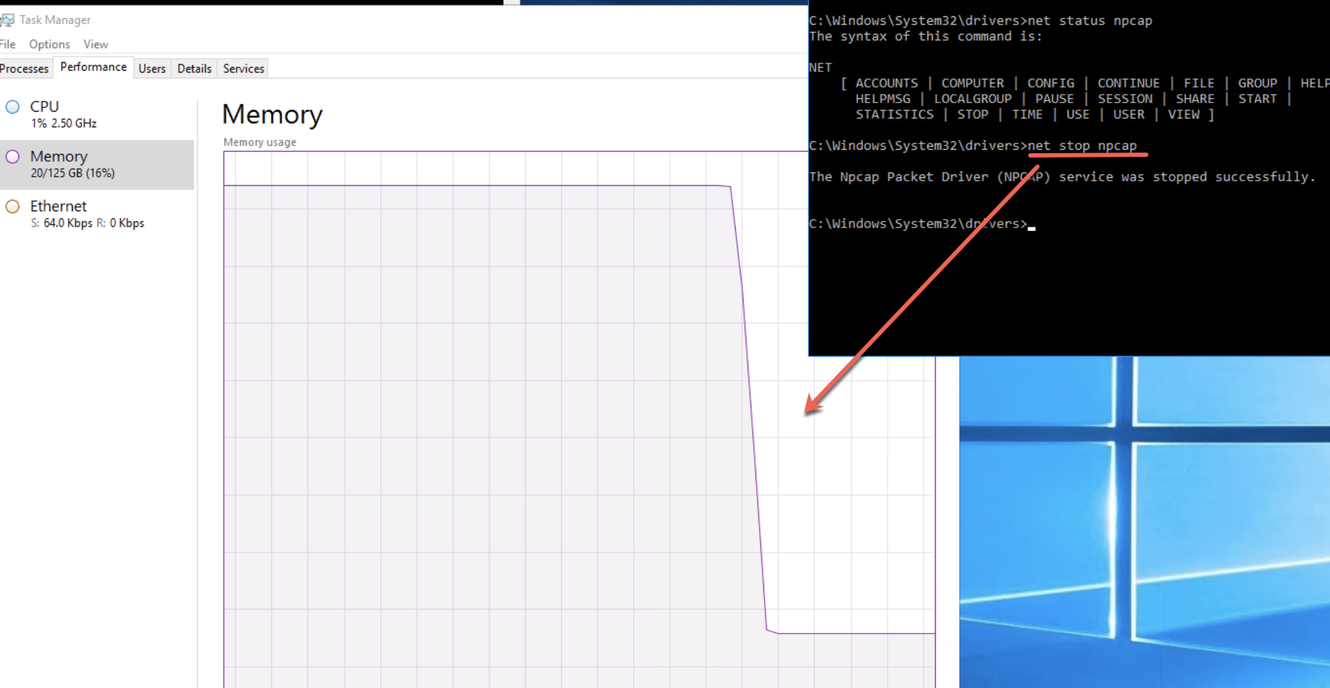 네.. net stop 명령어로 npcap의 서비스를 중지 합니다. 그러자 아래 그림처럼 드라마틱하게 메모리 사용량이 훅~~ 떨어졌습니다.