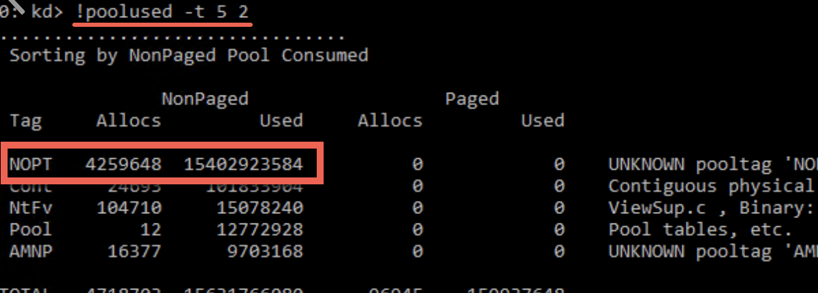 아무튼 환경 준비를 끝내고 심볼을 Fix 한 후 Livekd를 이용해서 live debuggig 이 가능 한 상태에서 다시 nonpaged pool을 많이 사용하는 pool tag를 확인 해 봅니다.